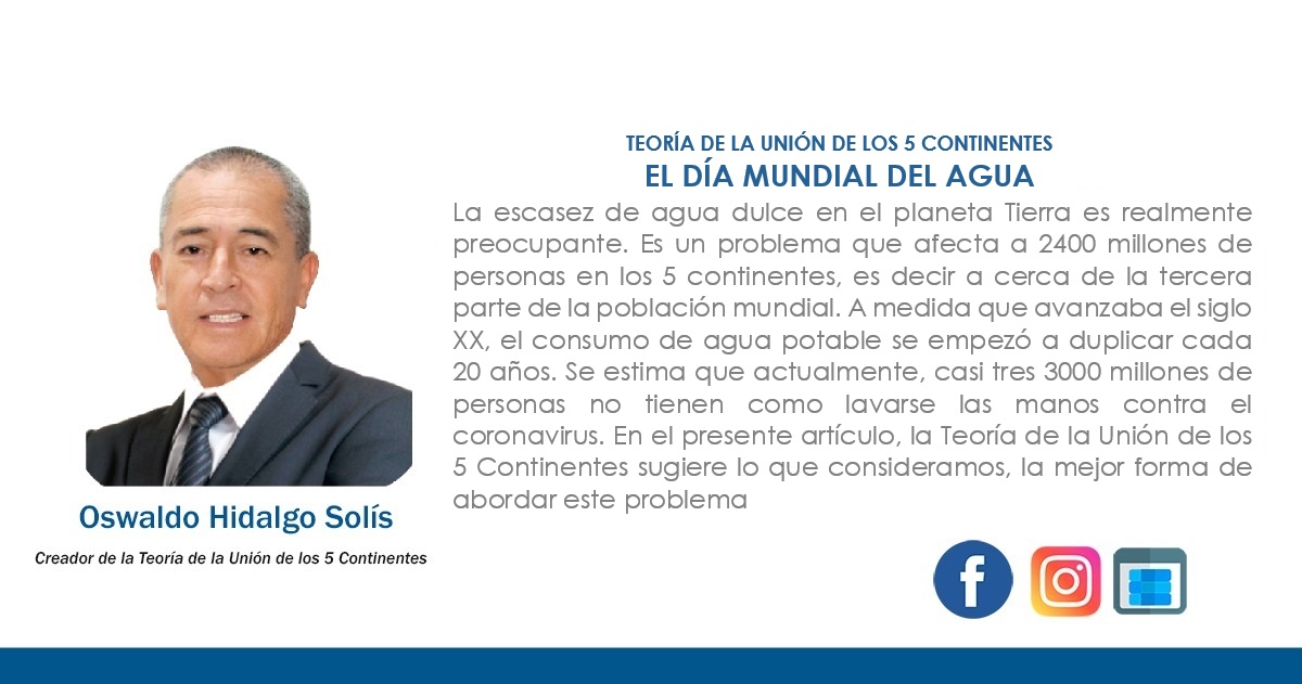 En la Conferencia de las Naciones Unidas sobre Medio Ambiente y Desarrollo efectuada en Río de Janeiro, Brasil del 3 al 14 de junio de 1992, se acordó que el 22 de marzo se celebre “el día mundial del agua”. El 2017, la Asamblea General de las Naciones Unidas acordó designar al período 2018 – 2028 como el “Decenio del agua”. Por otro lado, los objetivos de desarrollo sostenible de la ONU, que están en vigencia entre 2016 y 2030, tiene como objetivo 6: “agua limpia y saneamiento para todos”. Todos estos acuerdos de la ONU ponen de manifiesto la importancia del recurso hídrico para la vida del planeta Tierra. Si bien es cierto, el 70% de la superficie del planeta es agua, sólo el 3% es agua dulce y la mayoría, está congelada.
